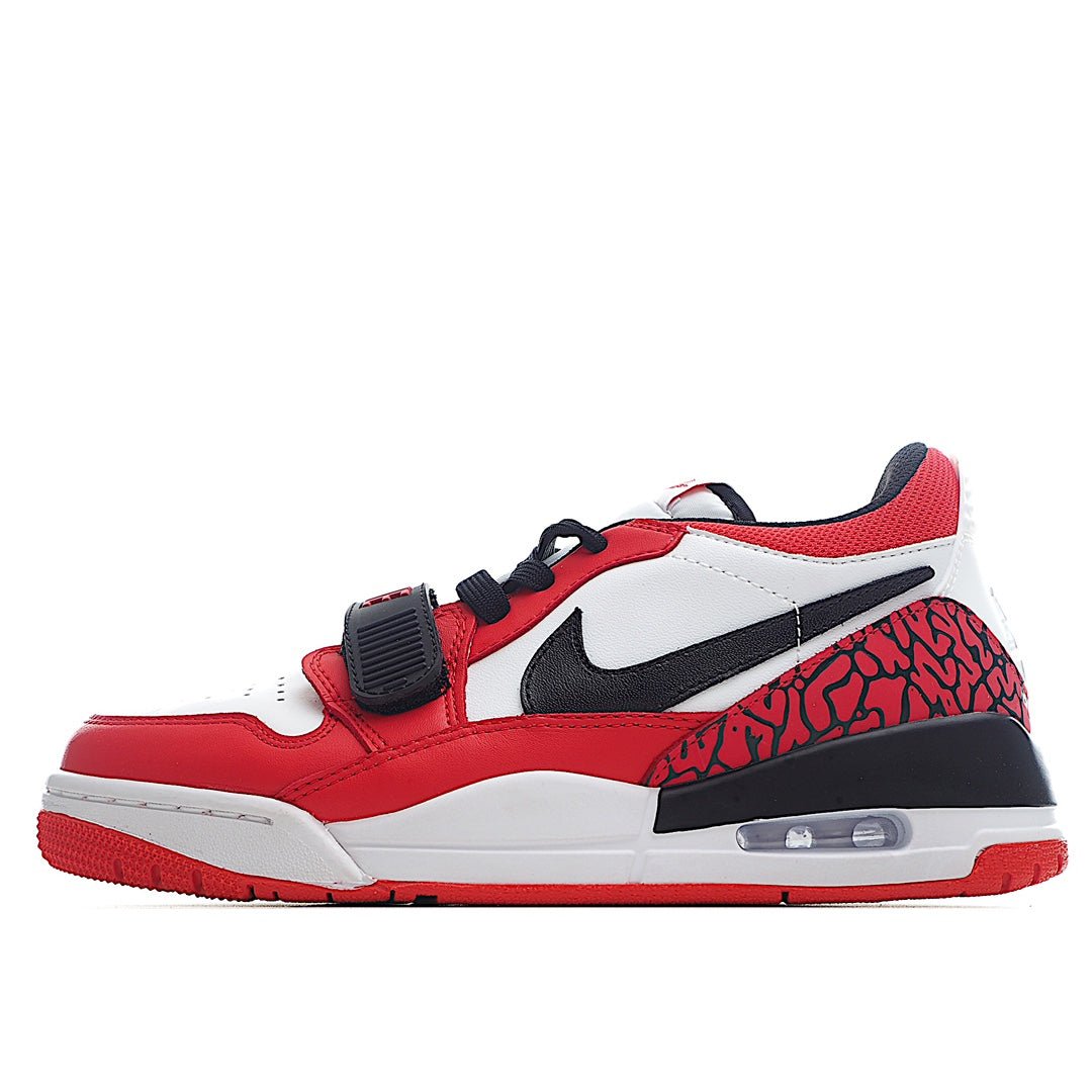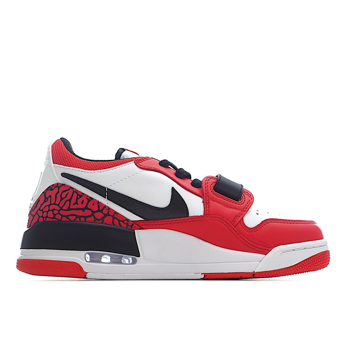 The upper features a clean white leather base, offering a crisp and versatile foundation. The classic patent leather mudguard is also white, creating a sleek and unified look. Accentuating the design are vibrant red highlights on the Jumpman logo, lace eyelets, and the inner lining, which add a dynamic pop of color and elevate the sneaker’s overall appeal. Black detailing on the laces, branding, and outsole introduces a sharp contrast, adding depth and visual interest to the design.
