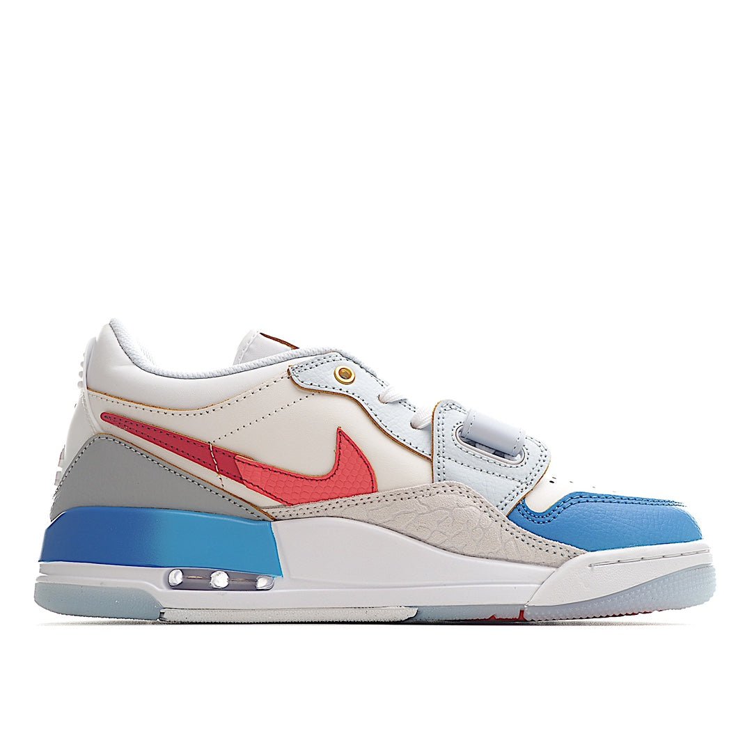 The upper is constructed from premium white leather, giving the sneaker a crisp and clean look. The signature patent leather mudguard also comes in white, creating a sleek, streamlined appearance. What makes this pair unique are the vibrant blue and red accents that bring the shoe to life. The blue highlights on the Jumpman logo and the inner lining provide a cool contrast, while the bright red detailing on the outsole and heel tab adds a pop of bold color, giving the sneaker a balanced yet eye-catching finish.