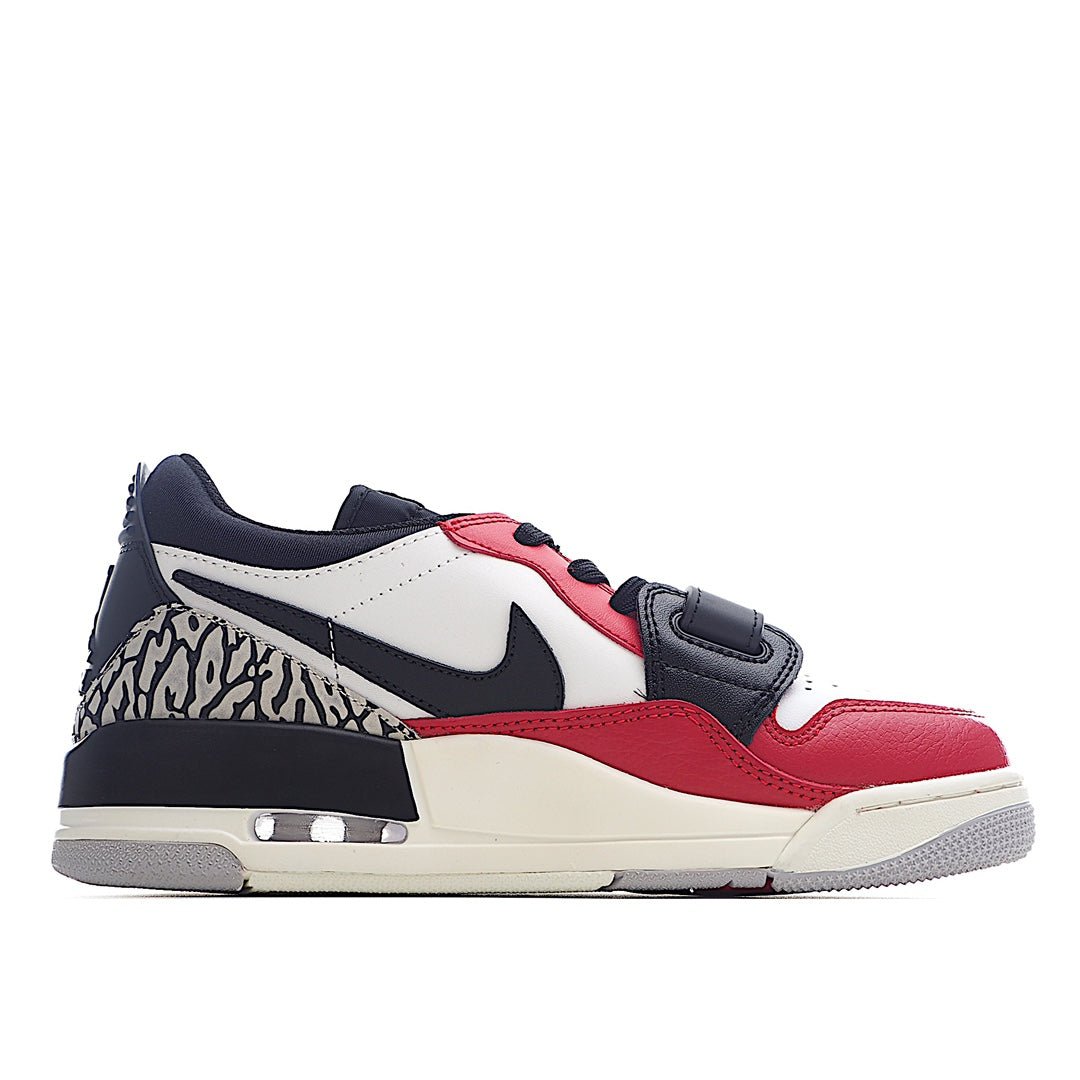 The upper is crafted from premium white leather, providing a clean and versatile base. The signature patent leather mudguard is also white, ensuring a sleek and unified appearance. The shoe's standout feature is the vibrant red accents, which are prominently featured on the Jumpman logo, the lace eyelets, and the inner lining. These red elements add a dynamic pop of color, reflecting the classic Chicago Bulls' colorway and enhancing the sneaker's visual appeal.