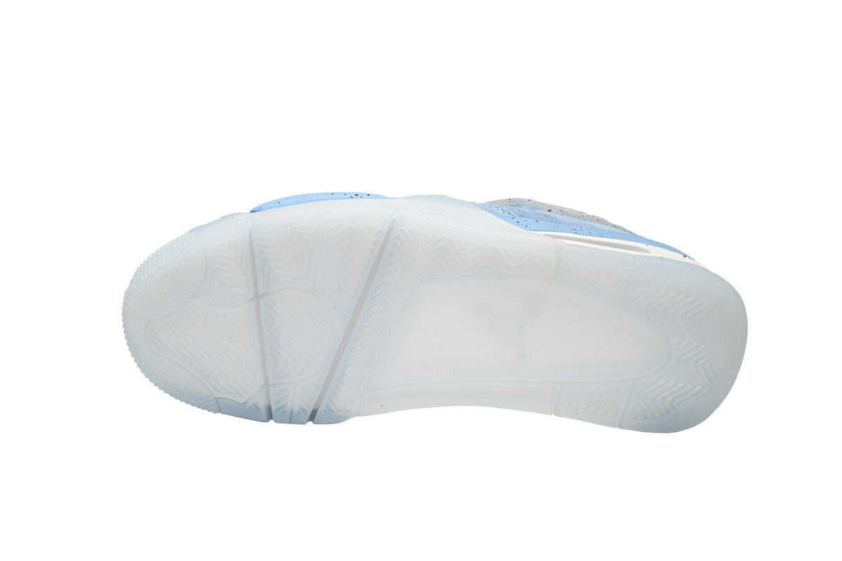 Designed for comfort and durability, the Air Jordan 4 Retro UNC includes visible Air-Sole units in the heel and forefoot, delivering responsive cushioning for all-day wear. The midsole is crafted in white with speckled detailing, while the outsole features a blend of blue and white with a herringbone pattern for enhanced traction on various surfaces.
