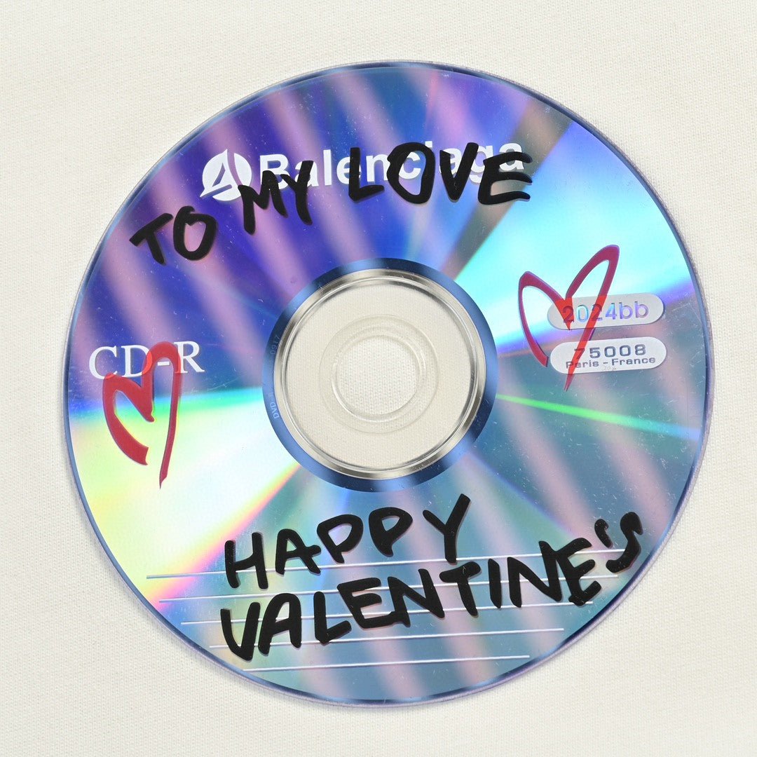 This Balenciaga t-shirt features a unique CD graphic with "Happy Valentine" text on the chest. Made from high-quality white cotton, it combines comfort with a playful and distinctive style. Perfect for making a casual fashion statement, this t-shirt is a versatile addition to any wardrobe.