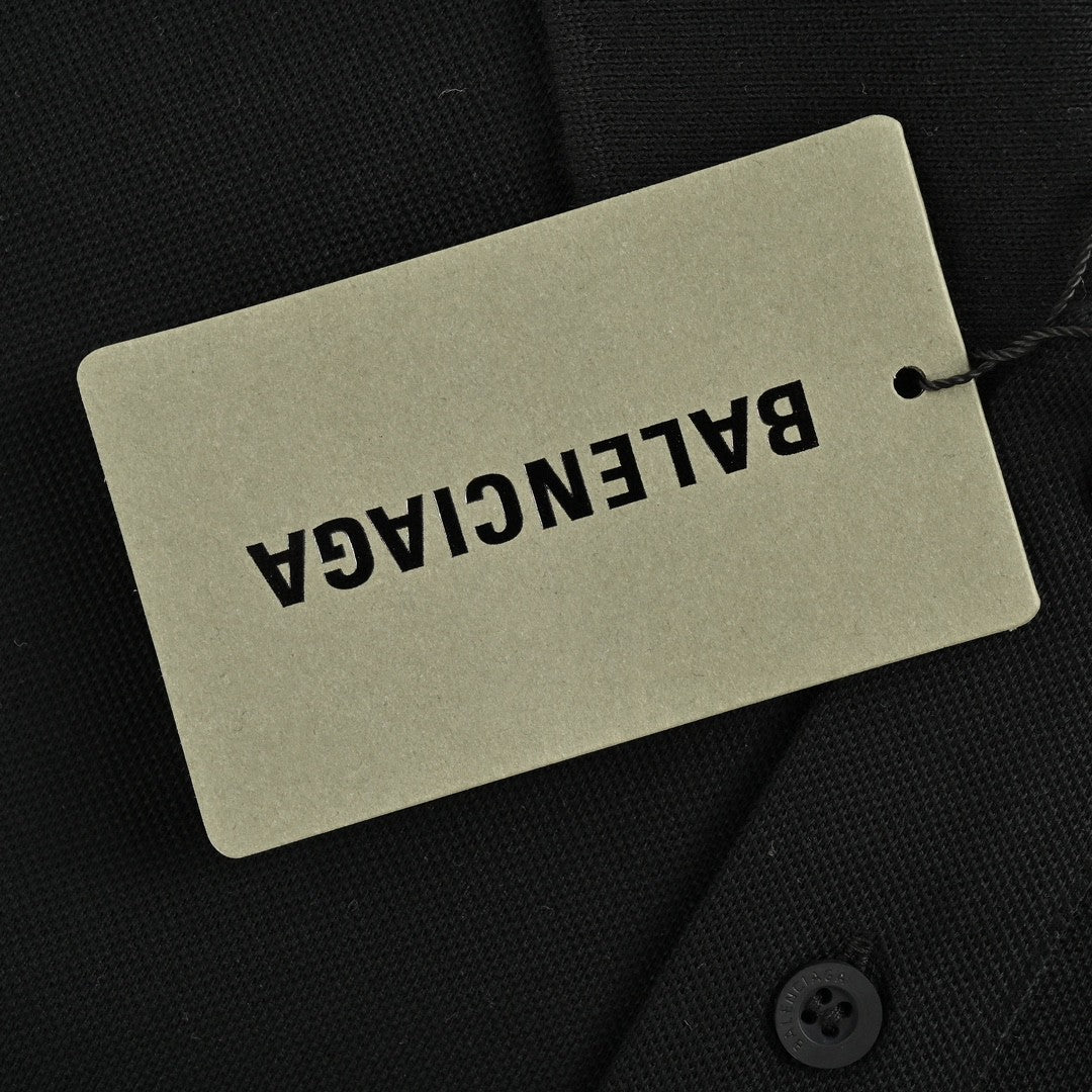This Balenciaga polo shirt in black features a classic design with a buttoned placket and a collar. The Balenciaga logo is embroidered on the chest in white, creating a striking contrast against the black fabric. This minimalist and versatile polo shirt is perfect for both casual and smart-casual occasions.