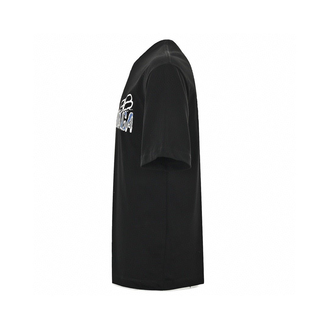 This Balenciaga t-shirt features a bold and unique distorted logo print in a playful, artistic style against a black background. Crafted from high-quality materials, this t-shirt offers both comfort and durability. Perfect for casual wear, it is a versatile piece that adds a contemporary flair to any outfit.