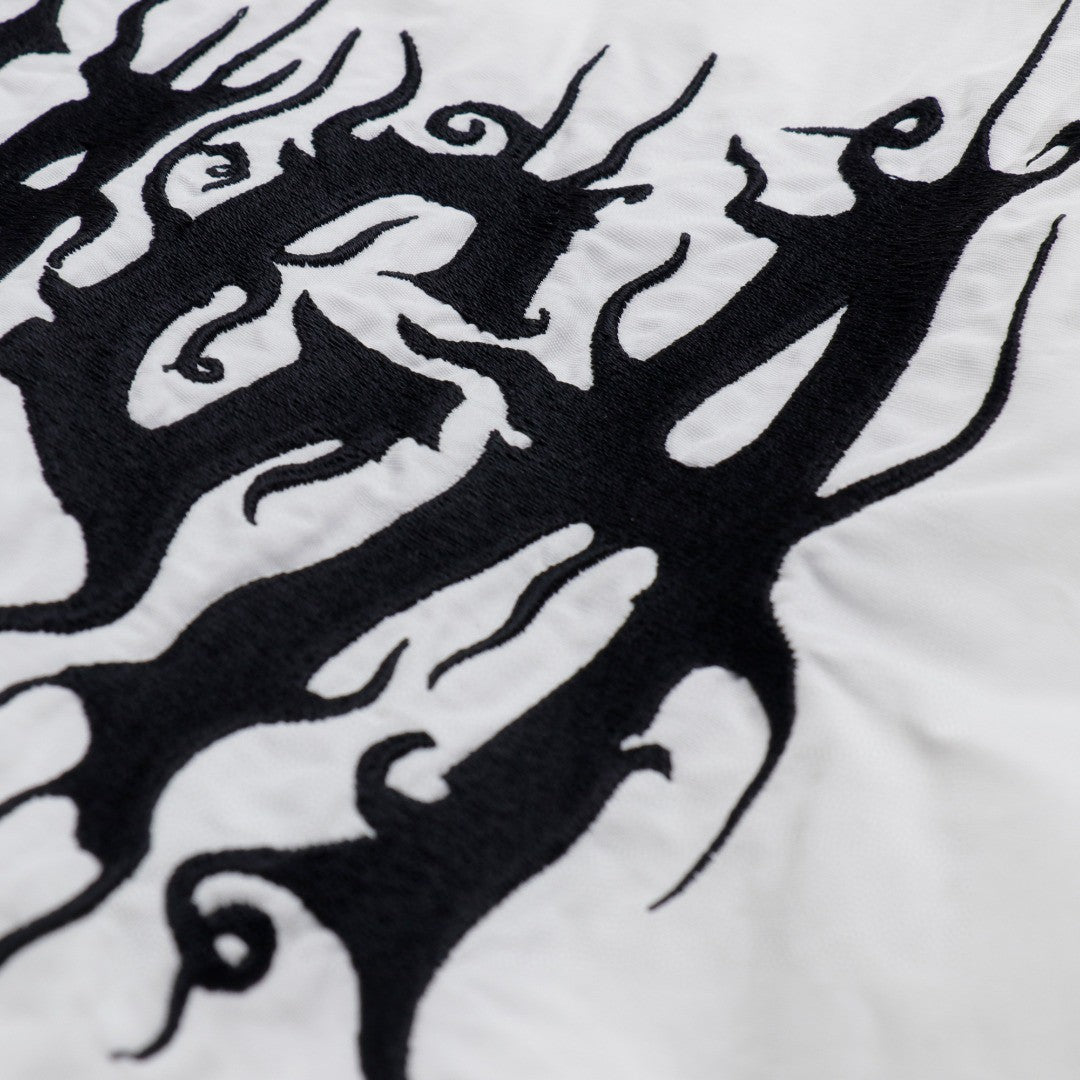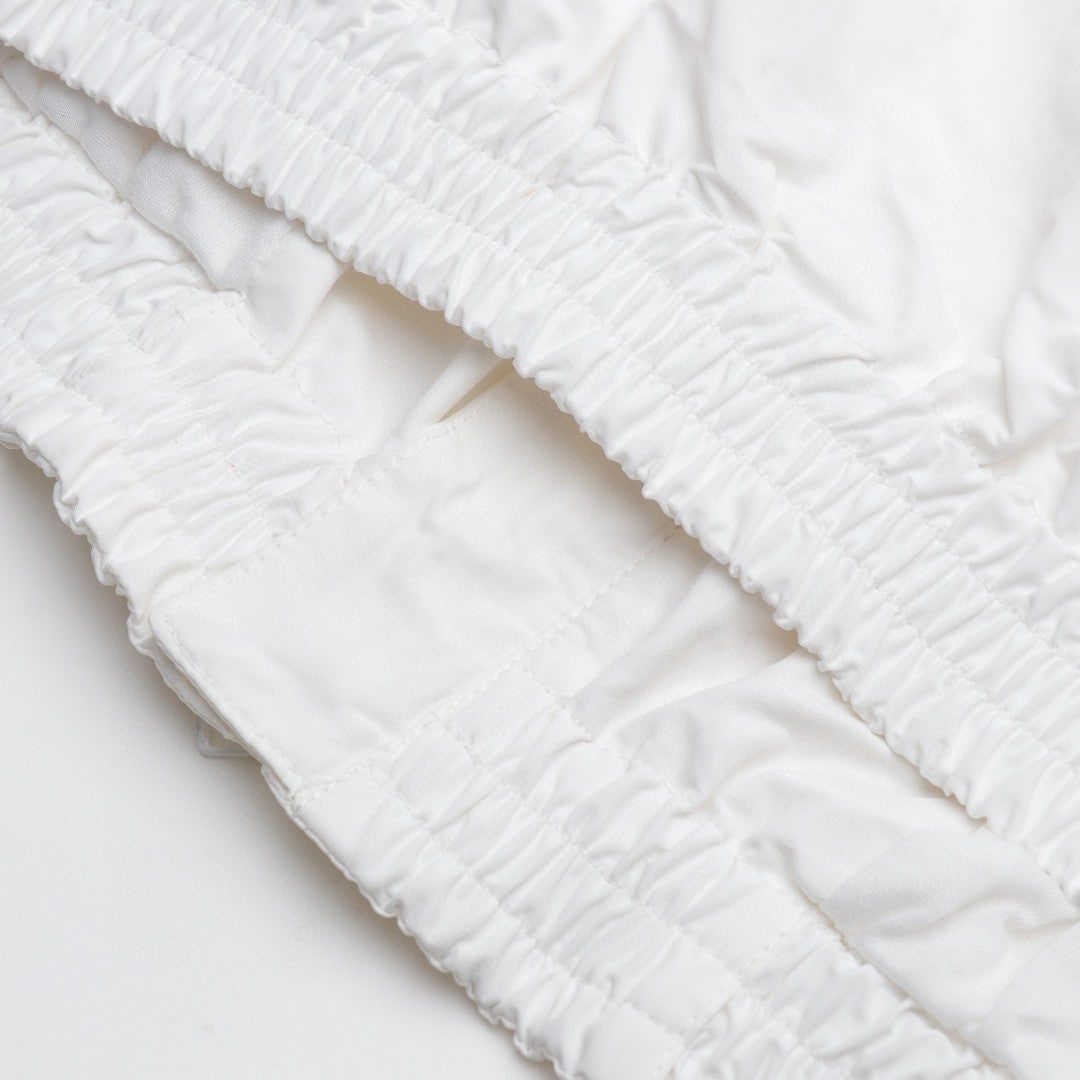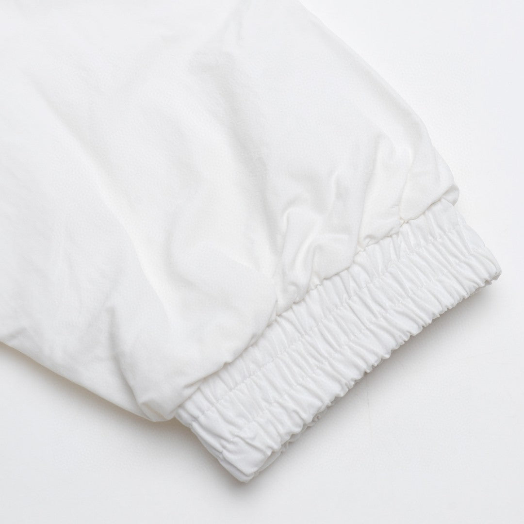 This Balenciaga jacket features a minimalist design in a clean white color. It has a front zip closure and two side pockets. The lightweight material makes it perfect for layering. Ideal for a sleek, modern look.