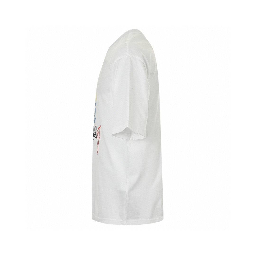 This Balenciaga t-shirt features a unique multicolor graphic logo on the front, combining vibrant colors with a distinctive design. The classic white background enhances the bold and artistic look, making it a standout piece for any fashion-forward wardrobe.