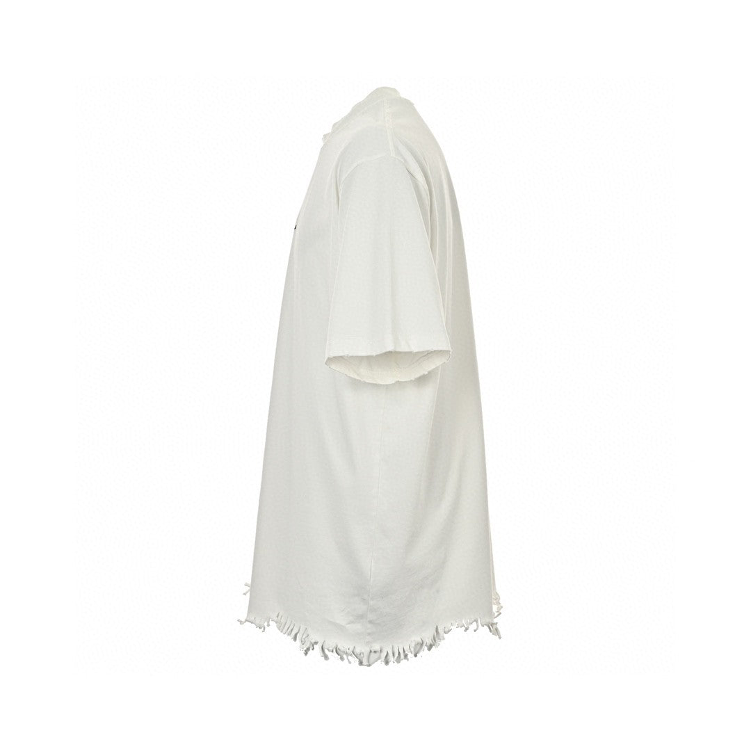 This Balenciaga t-shirt features a minimalist white design with a slightly distressed hem. The front is adorned with the Balenciaga logo in black. The clean lines and simple aesthetic make it perfect for a modern, casual look. Ideal for adding a touch of contemporary style to everyday outfits