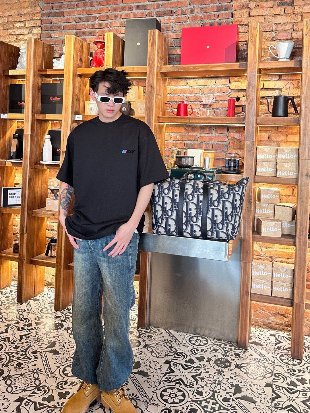 This Balenciaga t-shirt features a sleek black design. The front is adorned with a small, multicolored graphic in red, blue, and white, along with the Balenciaga logo in black. The minimalist aesthetic makes it perfect for a modern, casual look. Ideal for adding a touch of contemporary style to everyday outfits.