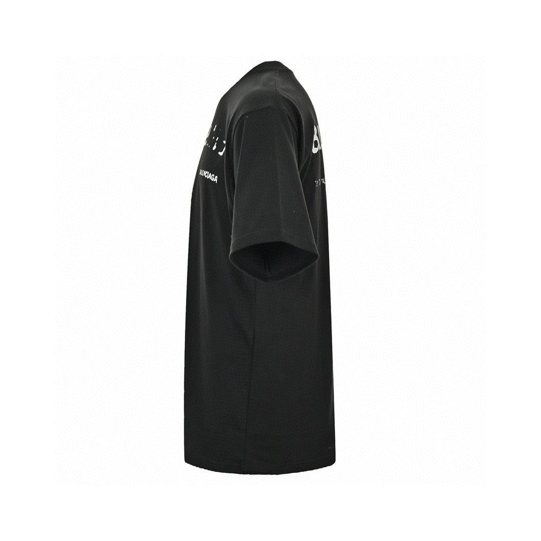 This Balenciaga t-shirt features a sleek black design. The front showcases a unique graphic with a partially obscured Balenciaga logo in white, creating an abstract look. The minimalist and modern aesthetic make it perfect for a contemporary, casual style. Ideal for adding a touch of edge to everyday outfits.