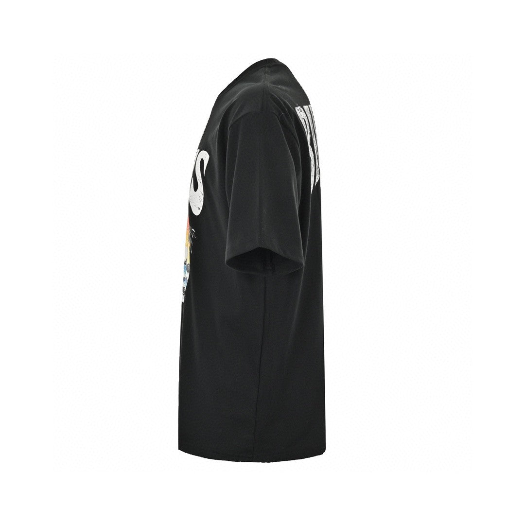 This Balenciaga t-shirt features a bold graphic design. The front showcases the word "Paris" in large, white text above a vibrant illustration of the Eiffel Tower set against a colorful sunset with palm trees. The design creates a striking visual contrast on the black fabric. Perfect for adding a touch of Parisian flair to your casual wardrobe.
