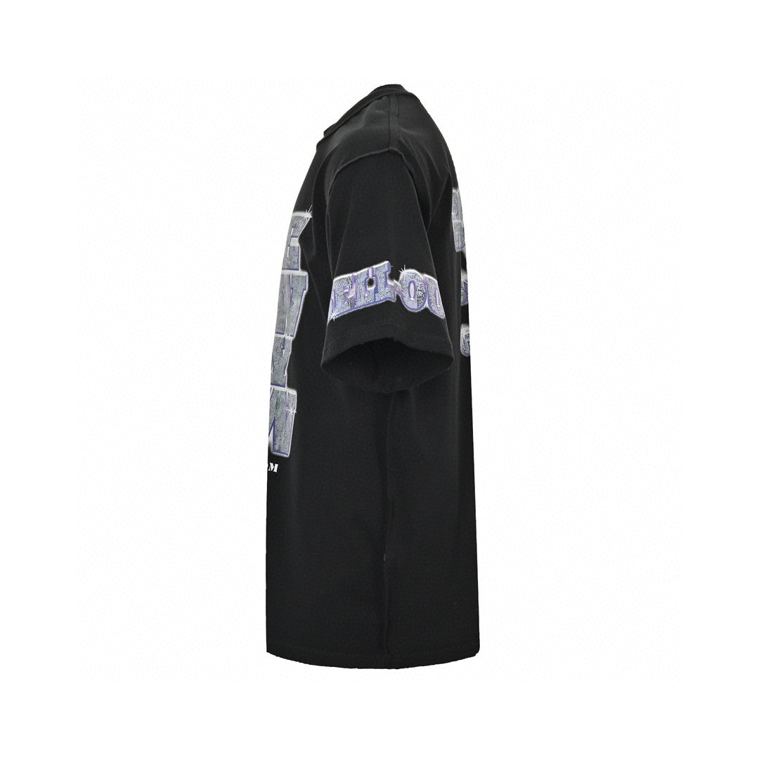 This Balenciaga t-shirt features a bold design with various texts and a graphic on the back. The black fabric serves as a striking backdrop for the eye-catching elements. The t-shirt includes phrases like "PRODUCT DROP," "CROSS-CATEGORY," "ROLL-OUT," "SELL-THROUGH," "ELEVATED," and "GAME CHANGER," along with a prominent graphic at the bottom. Perfect for those who appreciate unique and statement-making fashion pieces.