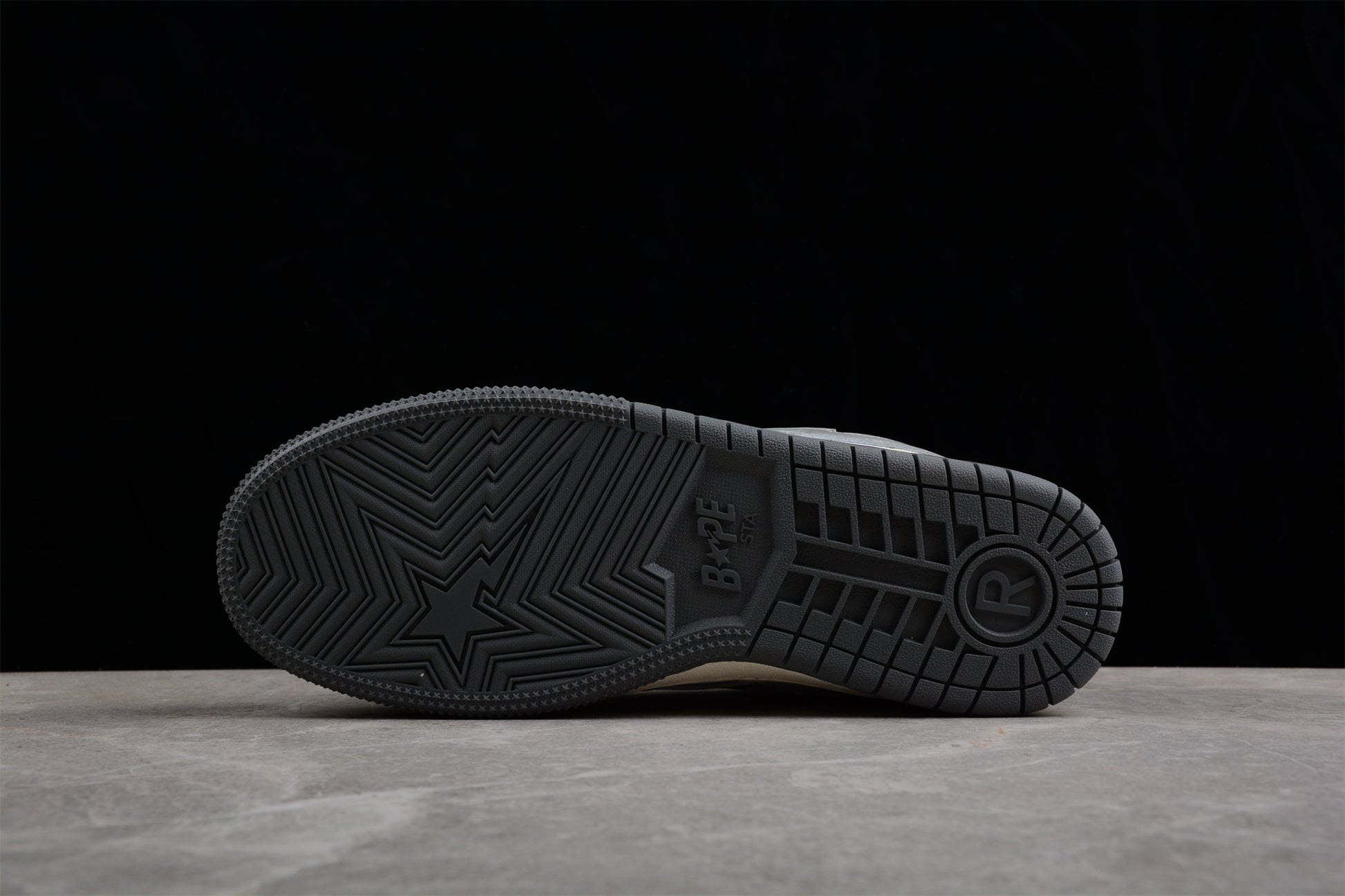 The thick rubber sole, in a classic cream color, not only complements the overall design but also provides excellent traction and durability. The sole features subtle BAPE branding, further enhancing the sneaker's unique appeal.