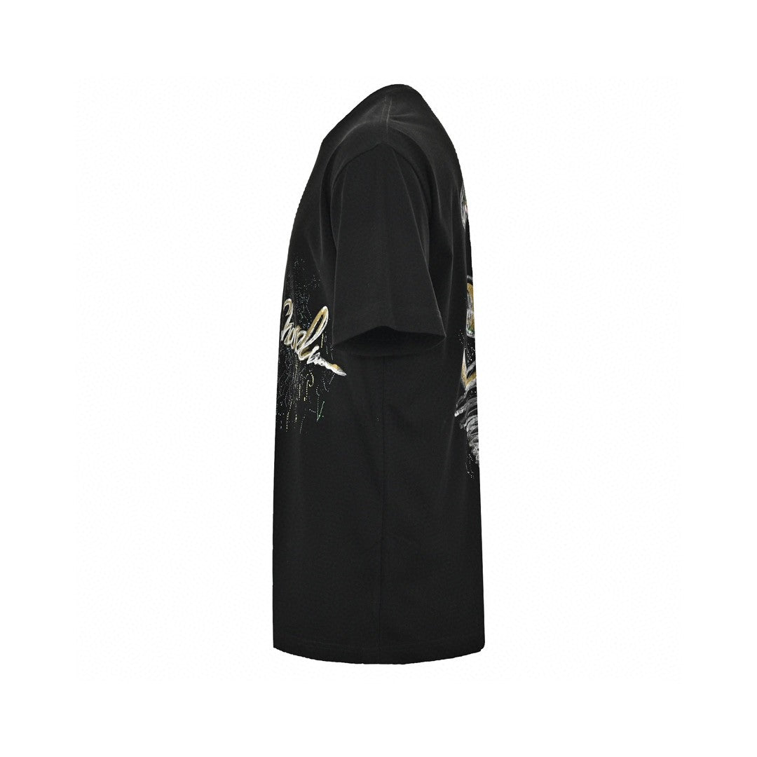This Chanel t-shirt features a minimalist black design. It has a subtle graphic on the front, including the Chanel logo in a handwritten style with a hint of abstract detail. The clean lines and simple aesthetic make it perfect for a modern, elegant look. Ideal for adding a touch of sophistication to casual outfits.