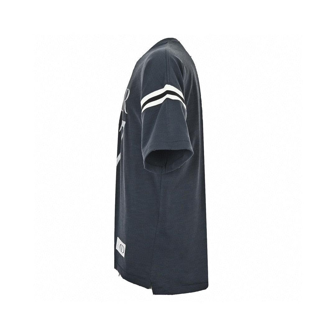 This Dior t-shirt features a bold "DIOR 47" graphic on the front. The shirt is dark grey with white stripes on the sleeves. A small Dior label is present at the bottom. The casual design offers a stylish and sporty look.