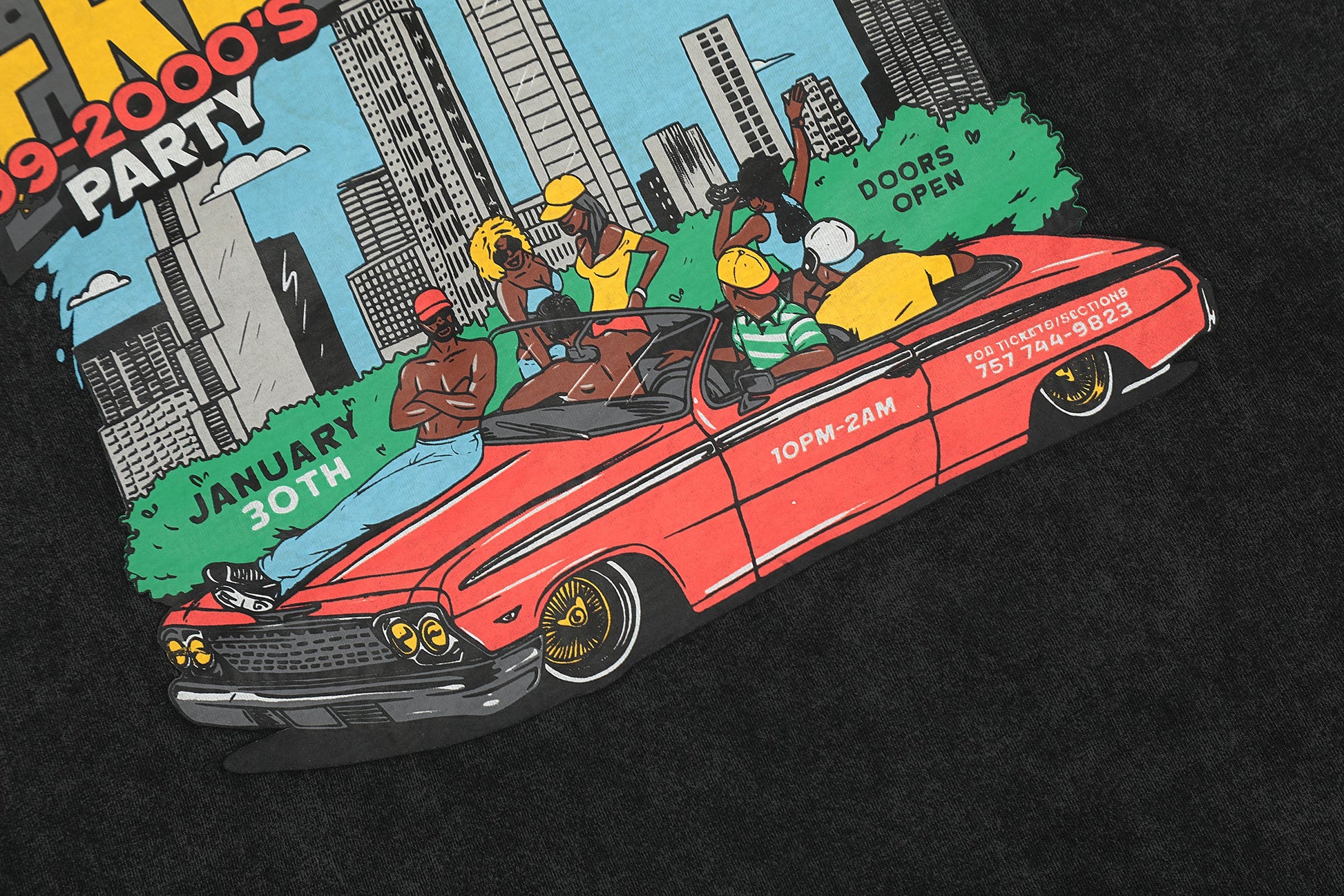 The front of the t-shirt features a vibrant and playful graphic inspired by the iconic Freaknik festival, a symbol of fun and youthful exuberance. The colorful design showcases a lively street scene with animated characters riding in a classic red convertible, set against the backdrop of a bustling city skyline. The bold "Freaknik" text in yellow adds a striking contrast, capturing the spirit of the 90s party culture.
