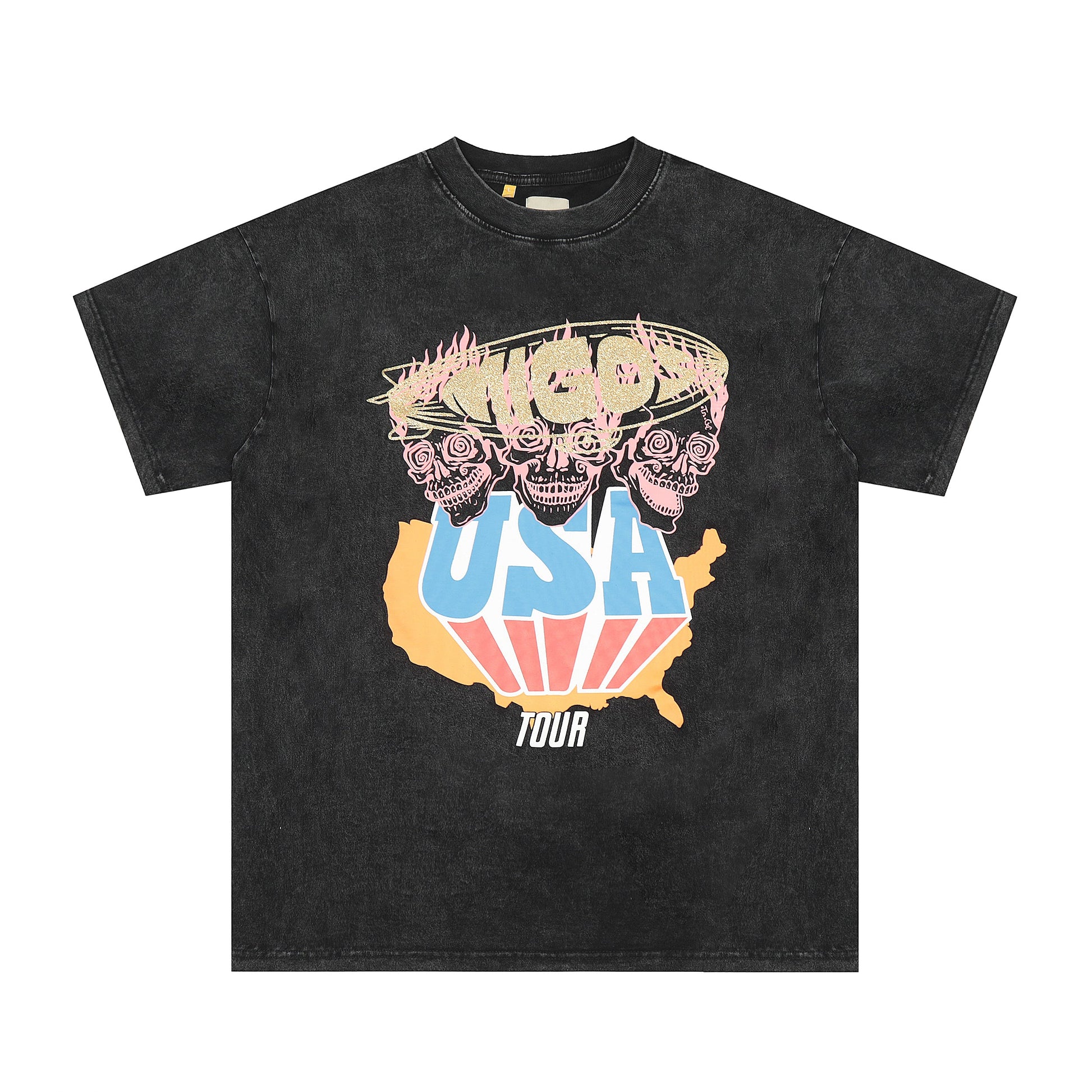 On the front, the t-shirt features a large, eye-catching graphic of a skull adorned with roses, set against the backdrop of a USA map. Below, the words "USA Tour" are prominently displayed in a retro, vibrant color palette that includes shades of pink, blue, and orange. This striking design captures the essence of rock tour merchandise, making it a standout piece that pays homage to classic Americana and the rebellious spirit of rock and roll.