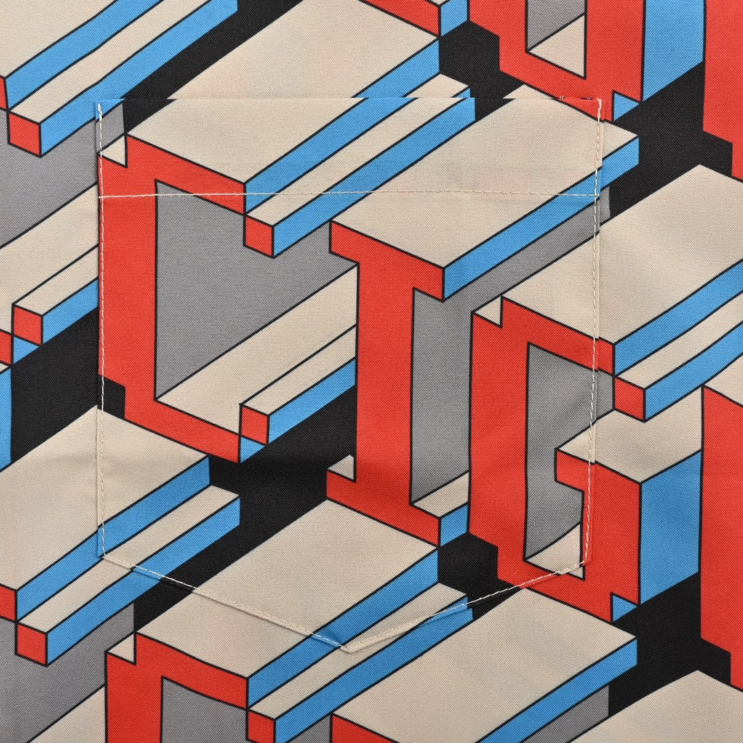 This Gucci shirt features an eye-catching geometric logo print in vibrant red, blue, and gray tones. The bold and dynamic design makes it a standout piece for a stylish and modern look, perfect for making a fashion statement.