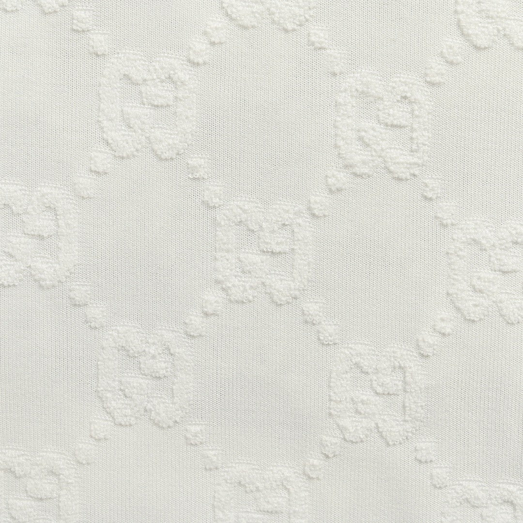 The Gucci GG Patterned T-Shirt in white is a sophisticated addition to any wardrobe. Made from high-quality cotton, this t-shirt features an all-over subtle GG monogram pattern, offering a luxurious and elegant look. The iconic Gucci logo is seamlessly integrated into the fabric, providing a refined touch without being too overt. This t-shirt is perfect for those who appreciate understated luxury and timeless style. Pair it with jeans, tailored trousers, or shorts for a versatile and chic outfit.