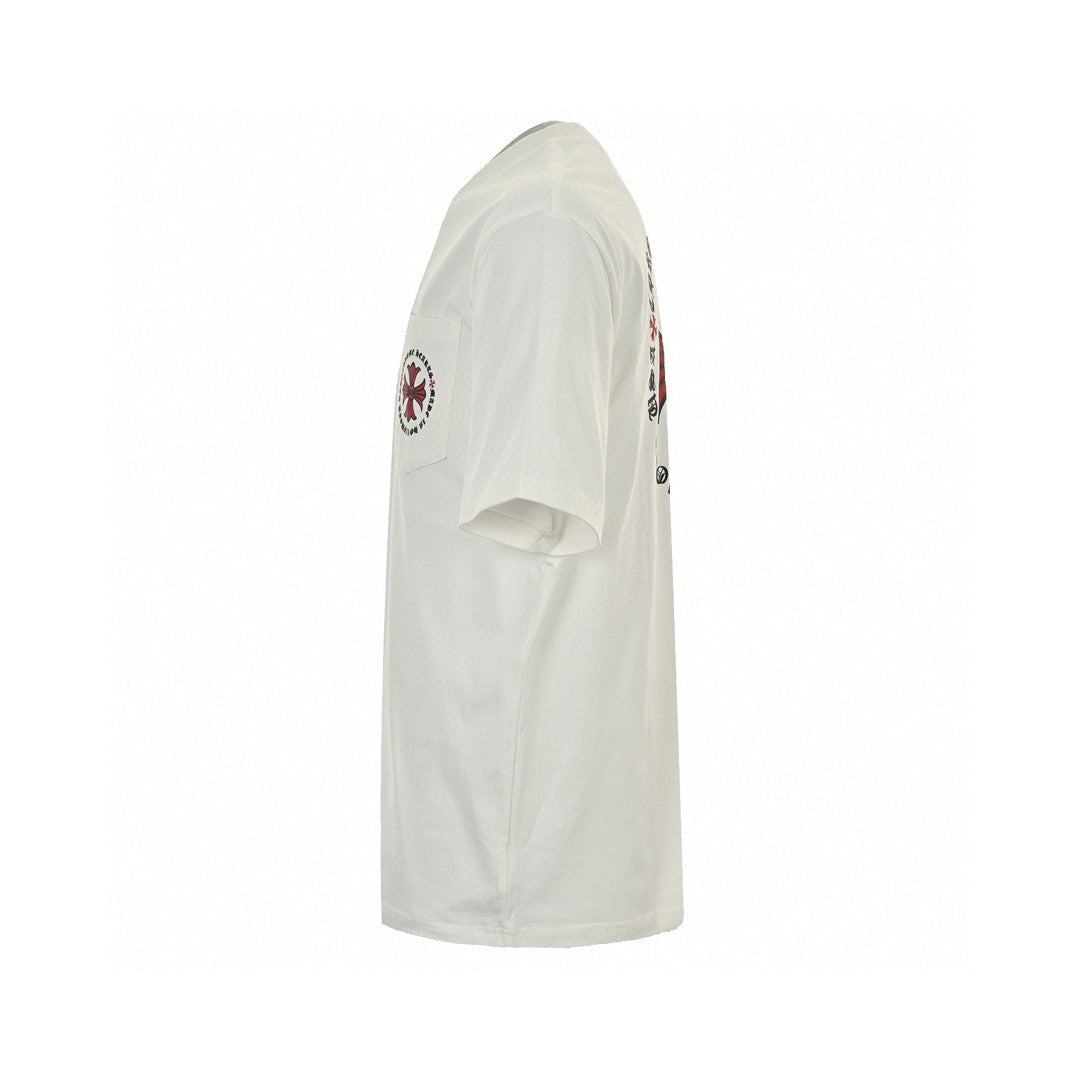 This Gucci Hearts t-shirt features a distinctive floral emblem on the chest pocket. The shirt is primarily white, offering a relaxed fit with short sleeves and a high neck. Perfect for adding a touch of elegance to your casual wear while staying comfortable.