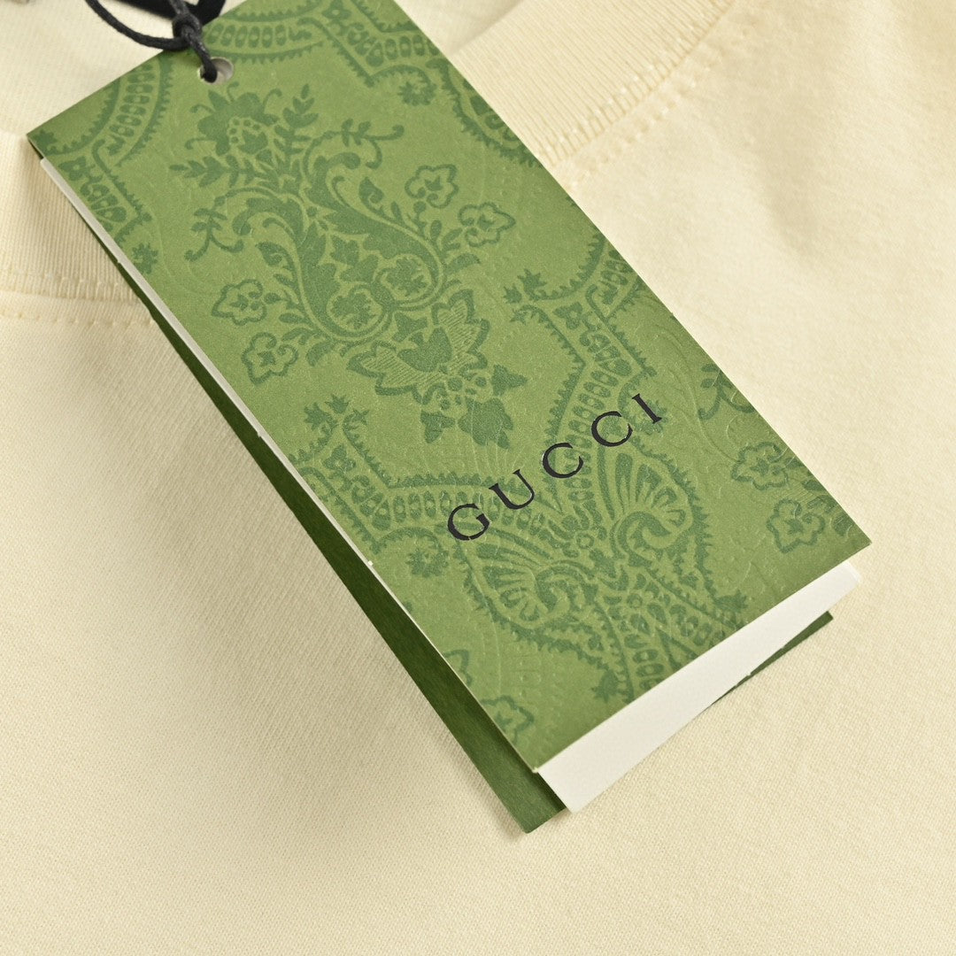 This Gucci t-shirt features a classic cream-colored design with an interlocking GG logo in red and green on the chest. Made from high-quality cotton, it combines comfort with iconic branding. Perfect for a stylish and casual look, this t-shirt is a versatile addition to any wardrobe.