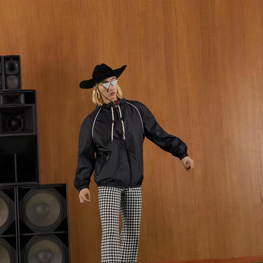 Black hooded jacket with zip closure. Features white piping and drawstrings with Gucci branding. Side zip pockets for convenience. Lightweight and perfect for casual wear.
