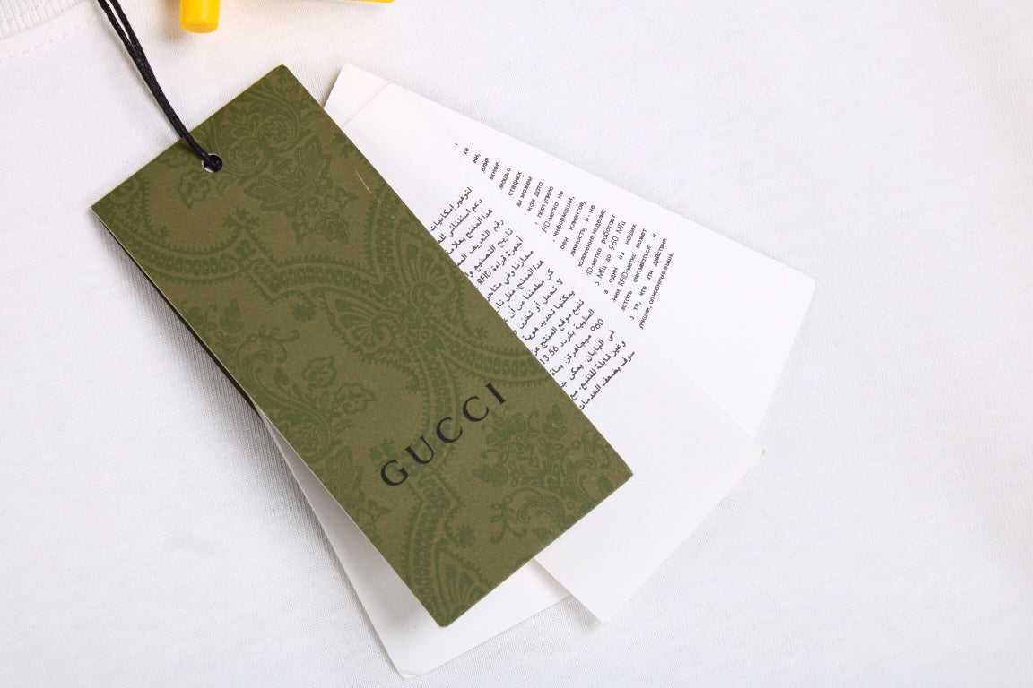 A playful Gucci t-shirt featuring colorful leopards and bold text. White color with yellow "GUCCI LOVERS PLEASURE CLUB" print. Bright blue and red leopard graphics. Crew neck and short sleeves. Adds a fun twist to your wardrobe.