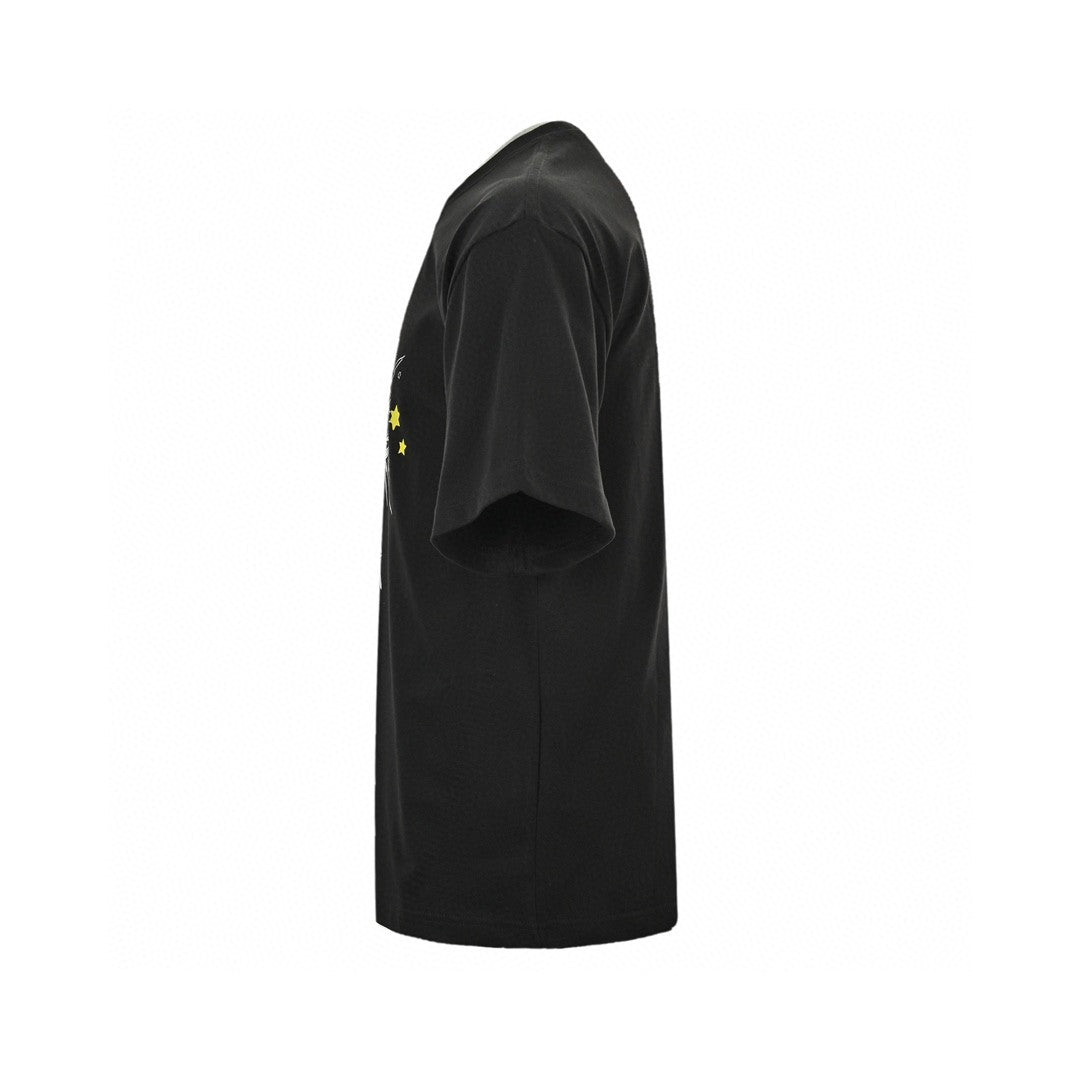 This Gucci t-shirt features a striking central eye graphic surrounded by rays and stars, creating a mystical and captivating design. The sleek black background highlights the intricate artwork, making it a unique and stylish piece for any wardrobe.