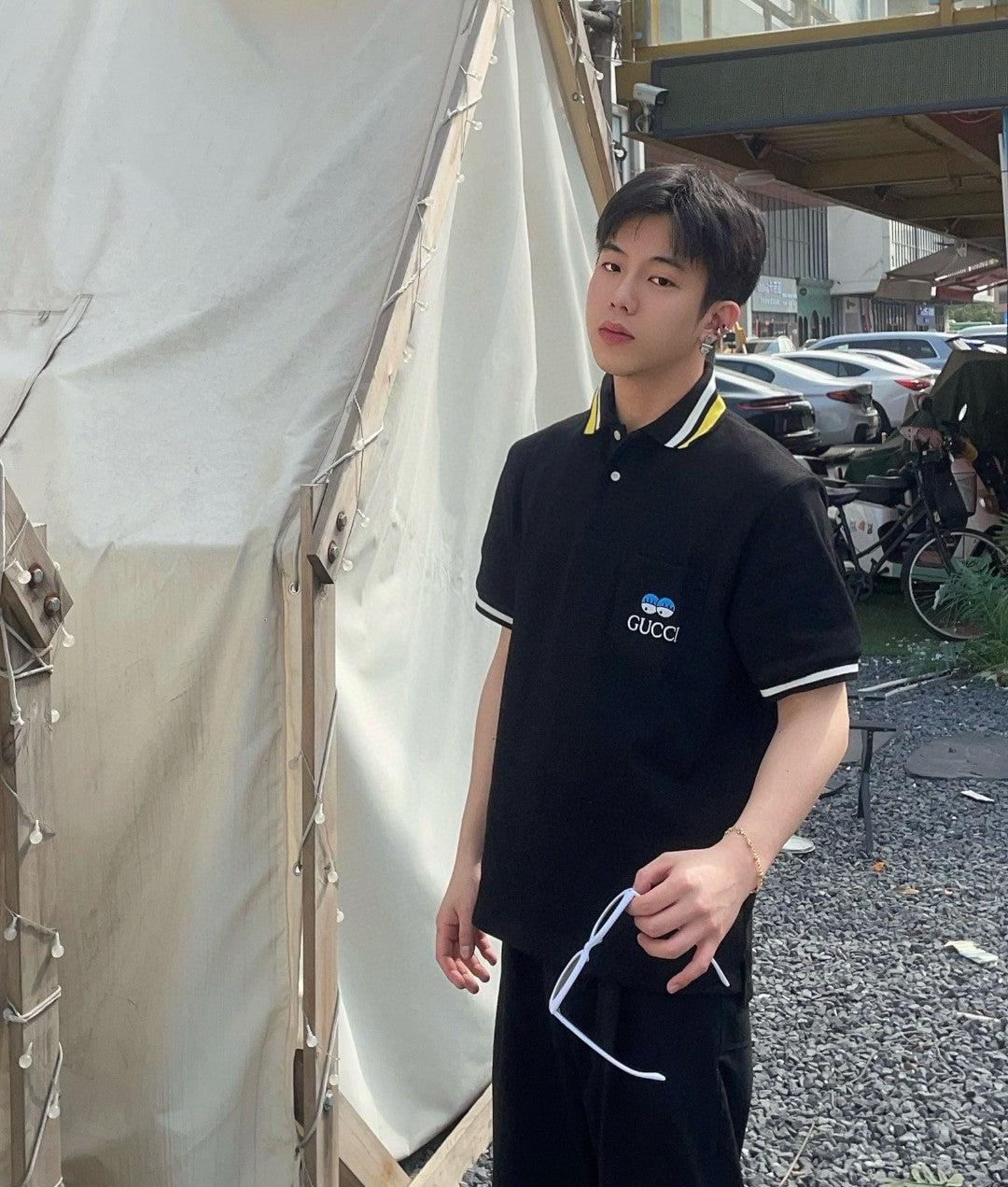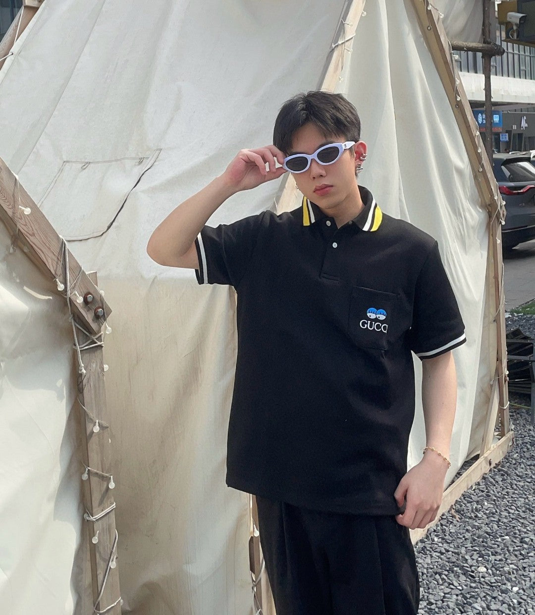 This Gucci polo shirt features a sleek black design with white and yellow trim on the collar and sleeves. It has a chest pocket adorned with the Gucci logo and a small graphic of two faces. The classic polo collar and button placket make it perfect for a refined, casual look. Ideal for adding a touch of sophistication to your wardrobe.