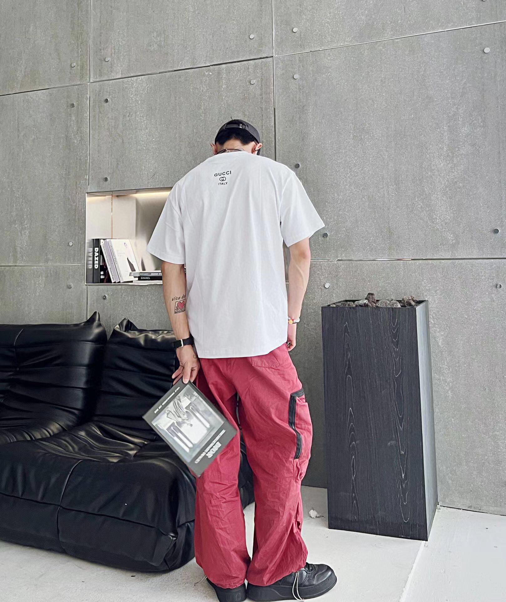 This white Gucci t-shirt features a playful and eye-catching design of oversized sunglasses on the chest. The sunglasses graphic is adorned with the iconic interlocking GG logo in vibrant pink and yellow, adding a touch of whimsy and color to the classic tee. Perfect for adding a bold statement to any casual outfit.