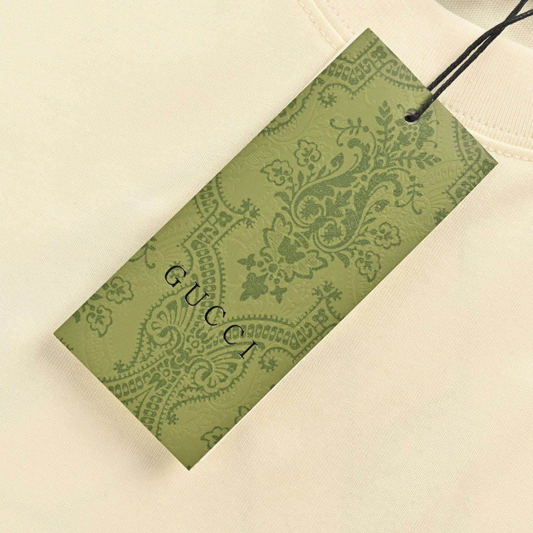 This Gucci t-shirt features a subtle triangle logo on the chest. The shirt is primarily beige, offering a relaxed fit with short sleeves and a high neck. Perfect for adding a touch of understated luxury to your casual wardrobe while staying comfortable.