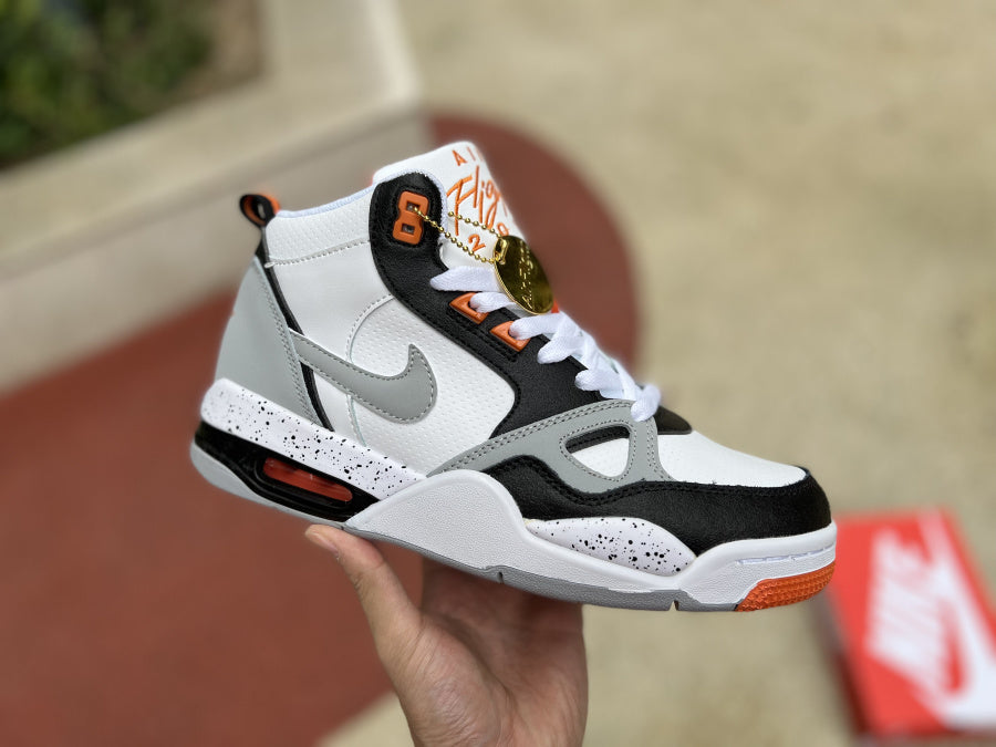 The sneaker shown in the image is the Nike Air Flight 89 in a vibrant White, Black, Grey, and Orange colorway. This retro basketball shoe pays homage to the classic designs of the late '80s and early '90s, capturing the essence of that era while incorporating modern details.