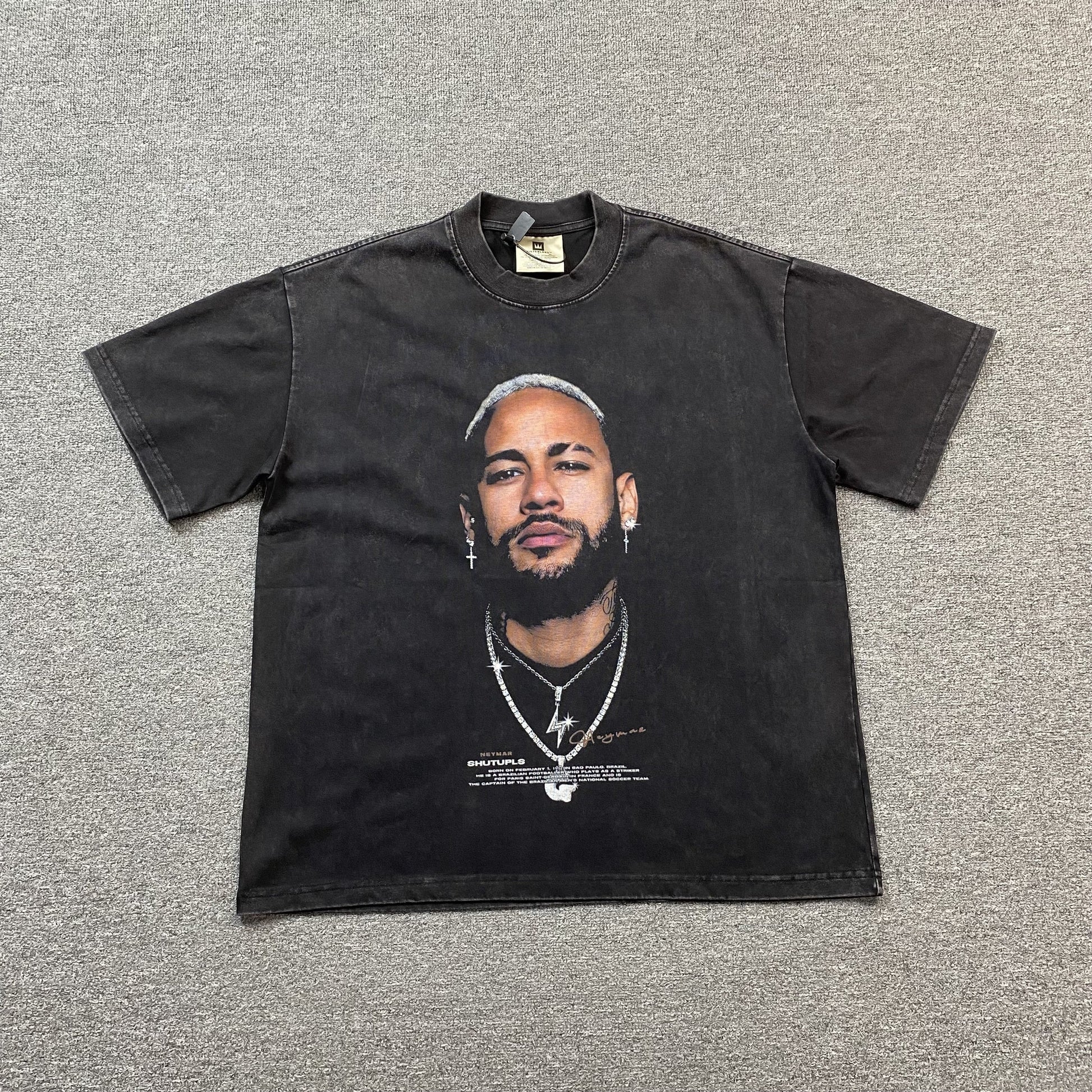 Featuring a faded, distressed graphic of Neymar, the washed dark grey colorway enhances its throwback appeal, making it look like a classic football-inspired tee. Designed with a relaxed fit, it pairs effortlessly with cargos, denim, or layered under a jacket, delivering a bold, street-ready look.