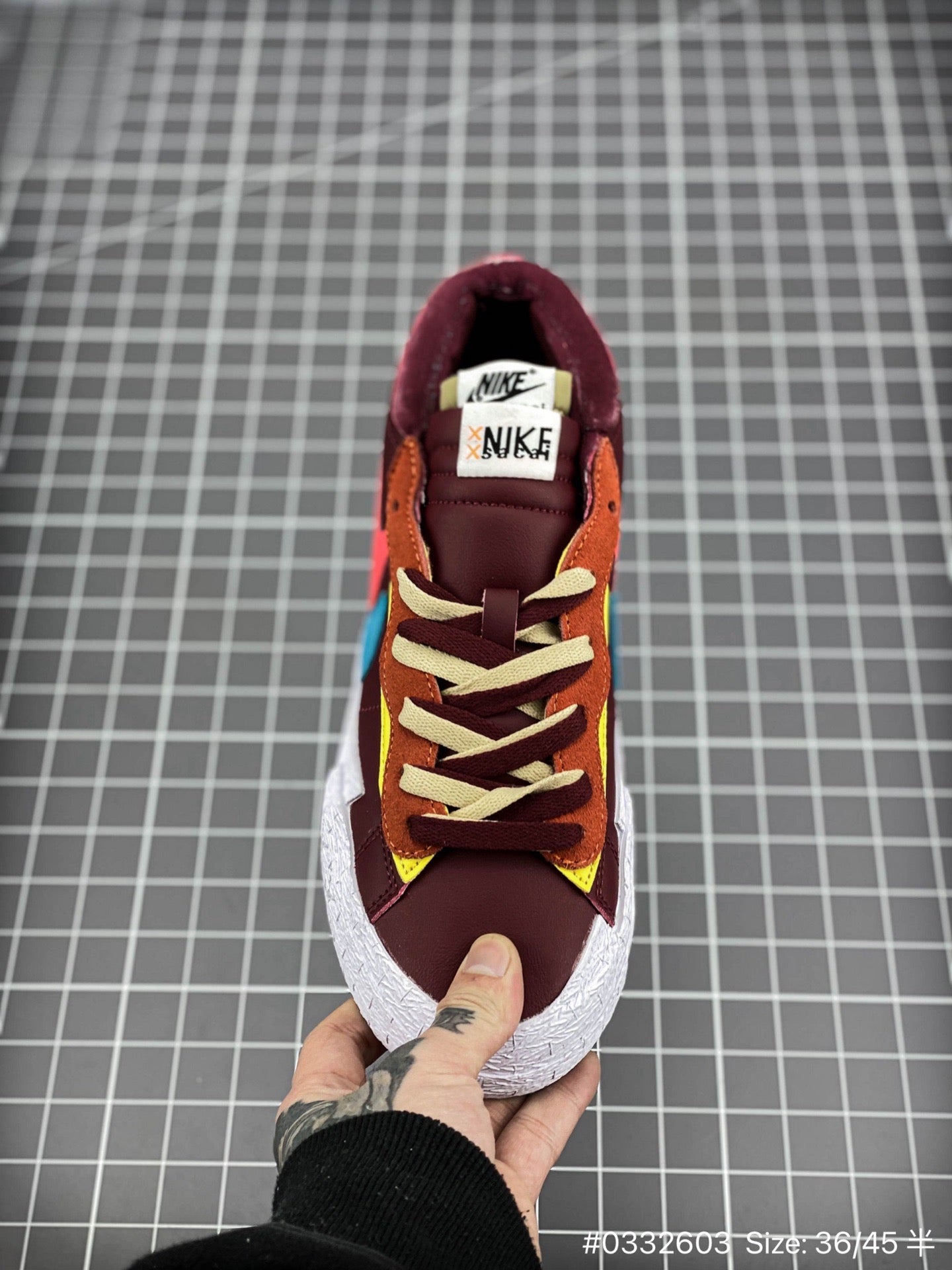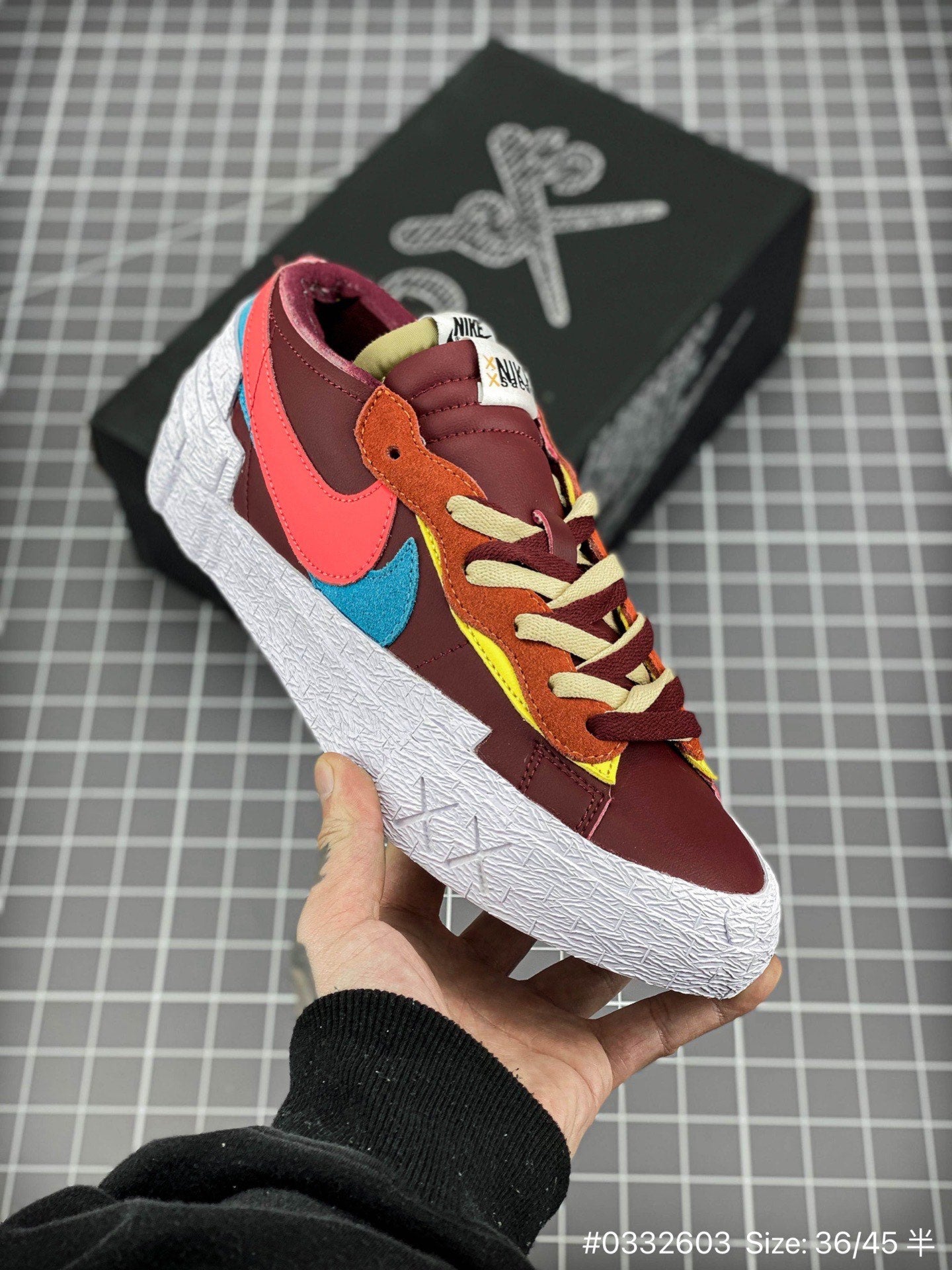 The KAWS x Nike Blazer "Team Red" delivers an artistic reinterpretation of the classic low-top silhouette with deconstructed elements and a rich, wine-red colorway. Crafted in collaboration with the renowned artist KAWS, this sneaker features a premium suede upper in deep burgundy, accented by exposed stitching and layered details that give it a raw, unfinished aesthetic. Signature KAWS "XX" branding is subtly integrated, adding a touch of exclusivity and creativity to the design. The deconstructed tongue and mismatched paneling further enhance the sneaker’s avant-garde vibe. A low-profile design ensures comfort and versatility, while the durable rubber outsole with a herringbone tread provides reliable grip and stability. Perfect for those who appreciate art-inspired footwear and bold design choices, the KAWS x Nike Blazer "Team Red" is a standout piece that effortlessly blends heritage with modern artistic flair.