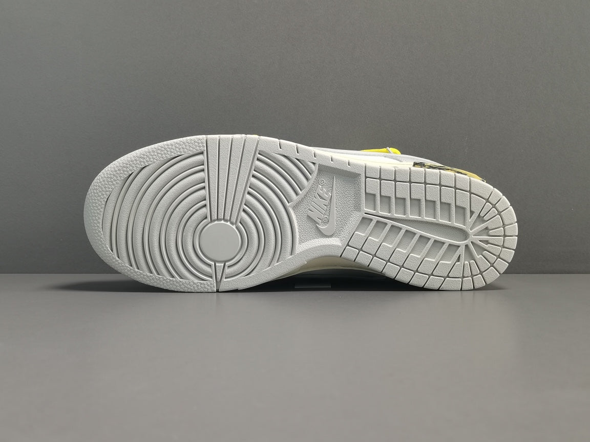 The Nike Dunk x Off-White Lot 27 sneakers showcase a captivating blend of materials, textures, and colors, resulting in a visually striking and unconventional aesthetic. With Off-White's signature deconstructed design elements, including exposed foam, stitching details, and text overlays, these sneakers embody a fearless and innovative style that sets them apart.