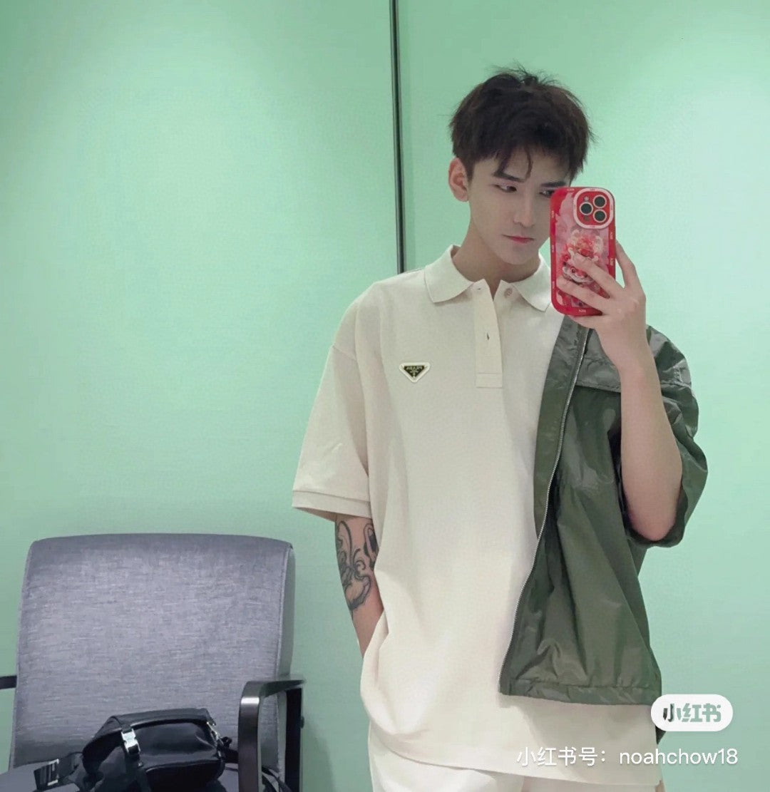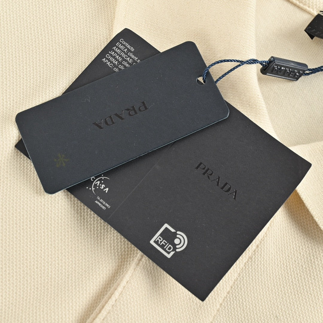 This Prada polo shirt features a simple yet elegant cream design. The shirt is adorned with the iconic Prada triangle logo on the chest. The classic collar and short sleeves make it perfect for a refined, casual look. Ideal for both formal and casual settings.