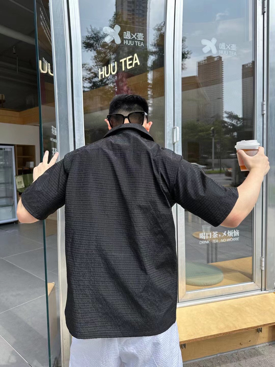 Black short-sleeve button-up shirt with a subtle checkered pattern. Features a front pocket and classic collar. Designed for a sleek and minimalist style.