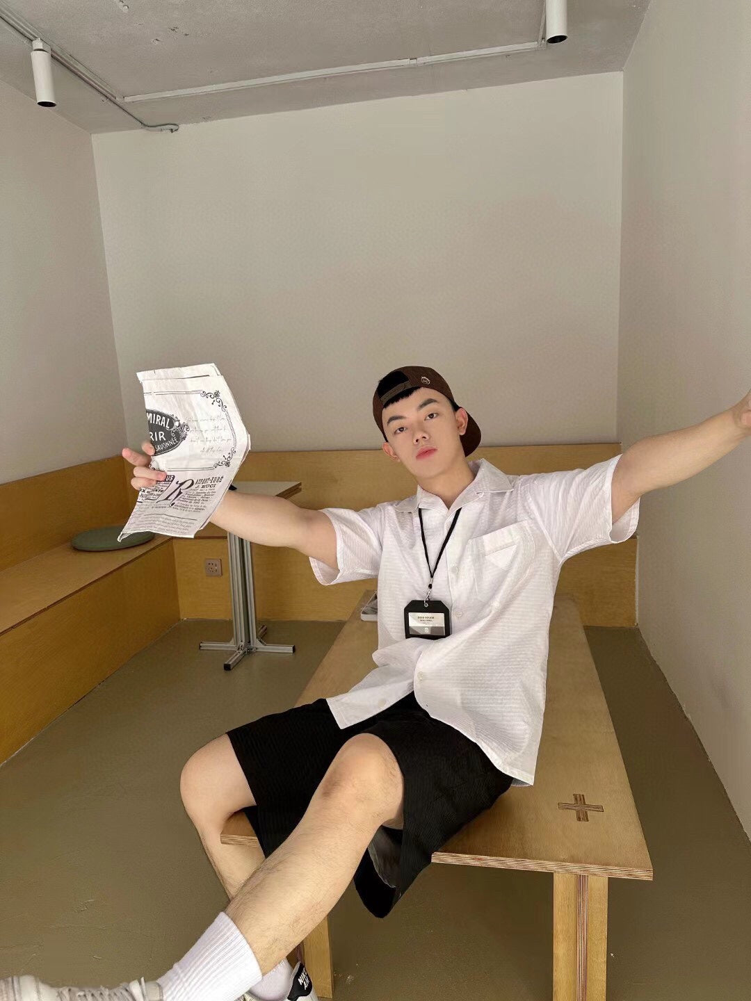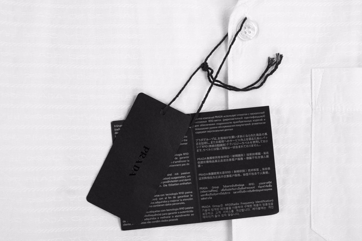 White short-sleeve button-up shirt with a subtle checkered pattern. Features a front pocket and classic collar. Designed for a sleek and minimalist style.