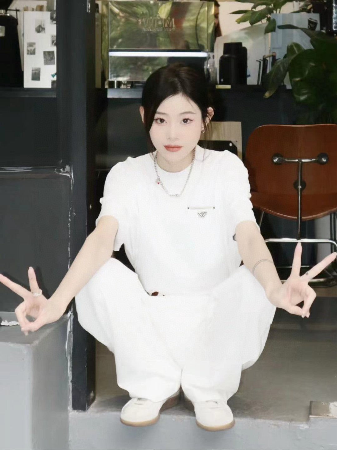 This Prada t-shirt features a minimalist white design. It has a small chest pocket with a zipper, adorned with the iconic Prada triangle logo. The clean lines and simple aesthetic make it perfect for a modern, refined look. Ideal for both casual and semi-formal occasions.