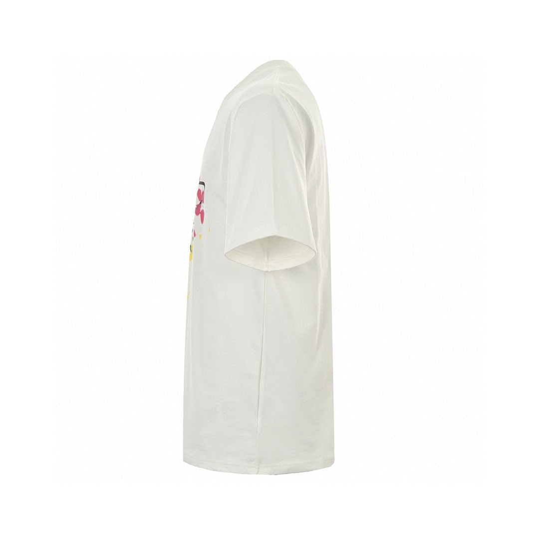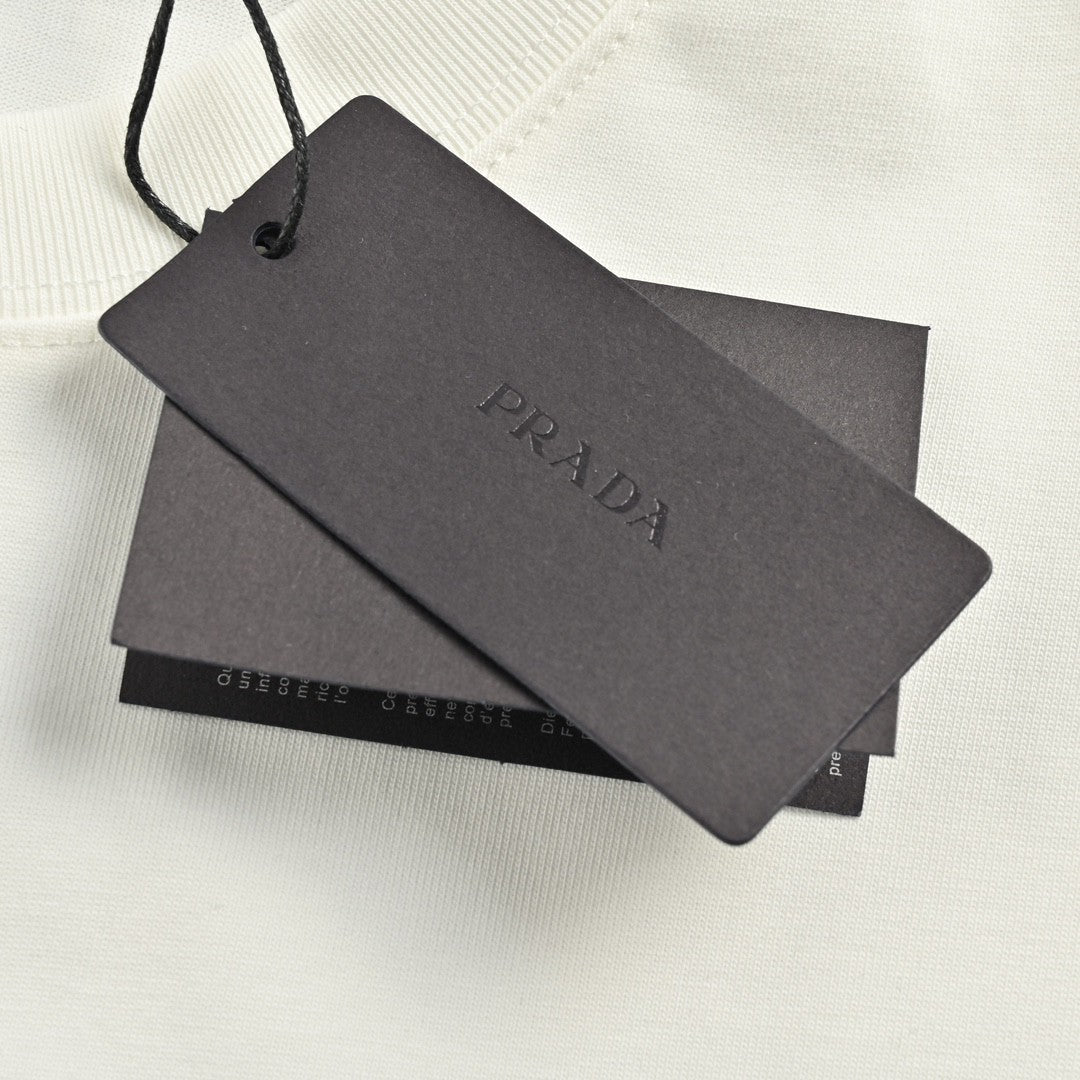 This Prada t-shirt features a unique design with the classic Prada Milano logo surrounded by colorful paint splatters in blue, yellow, and pink. The white fabric creates a fresh backdrop that makes the vibrant design stand out. Perfect for adding a playful and artistic touch to your casual wardrobe.
