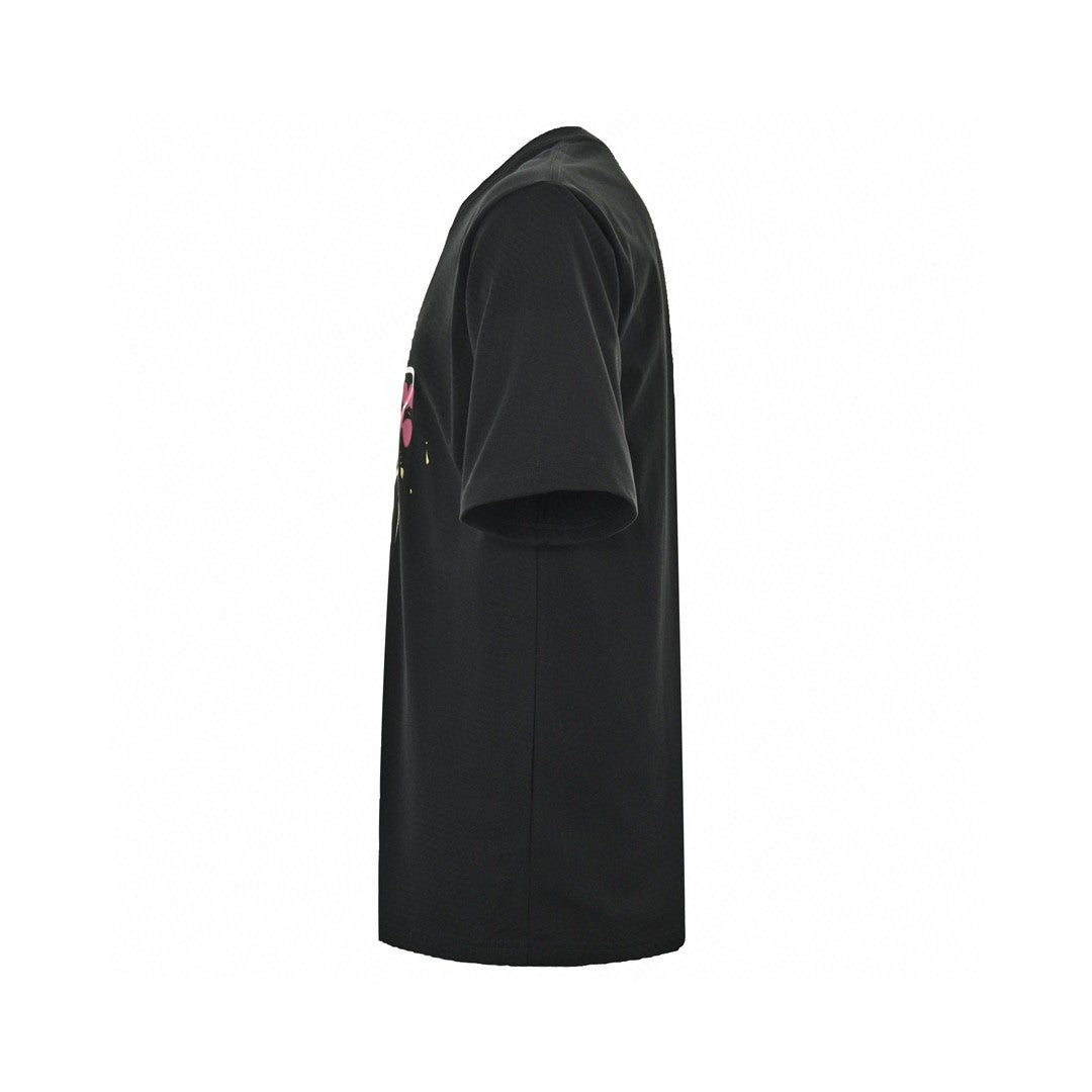 This Prada t-shirt features a unique design with the classic Prada Milano logo surrounded by colorful paint splatters in blue, yellow, and pink. The black fabric provides a bold backdrop that makes the vibrant design stand out. Perfect for adding a playful and artistic touch to your casual wardrobe.