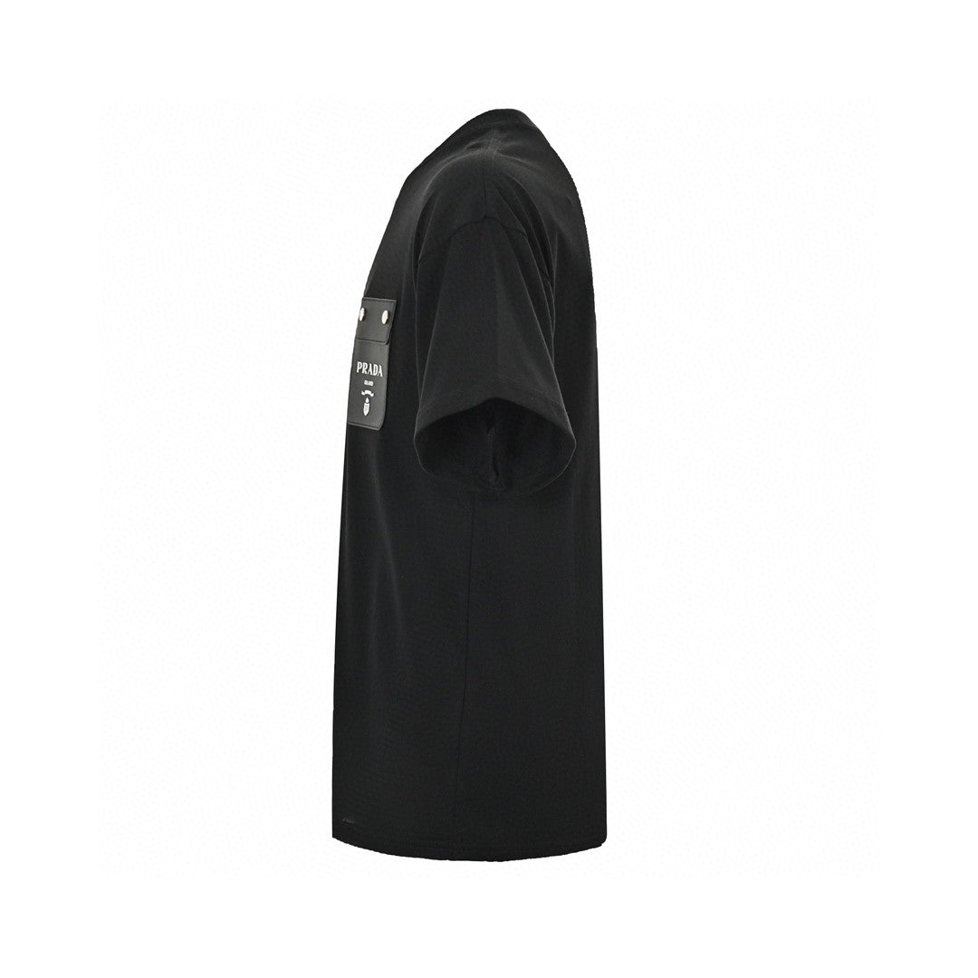 This Prada t-shirt features a minimalist design with a distinctive pocket detail on the front. The black fabric provides a sleek, modern look, while the small pocket includes the Prada logo and Milano text, adding a touch of elegance and functionality. Perfect for those who appreciate understated luxury in their casual wardrobe.