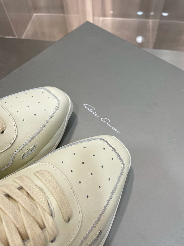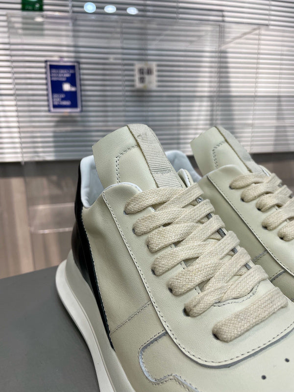 These sneakers feature a refined off-white leather upper, accentuated by a bold black panel at the heel. This striking combination creates a sophisticated and eye-catching look. The high-quality leather ensures durability and a luxurious feel, while the clean lines and minimalist design add a touch of modern elegance. Subtle perforations on the toe box enhance breathability and provide a refined detail.